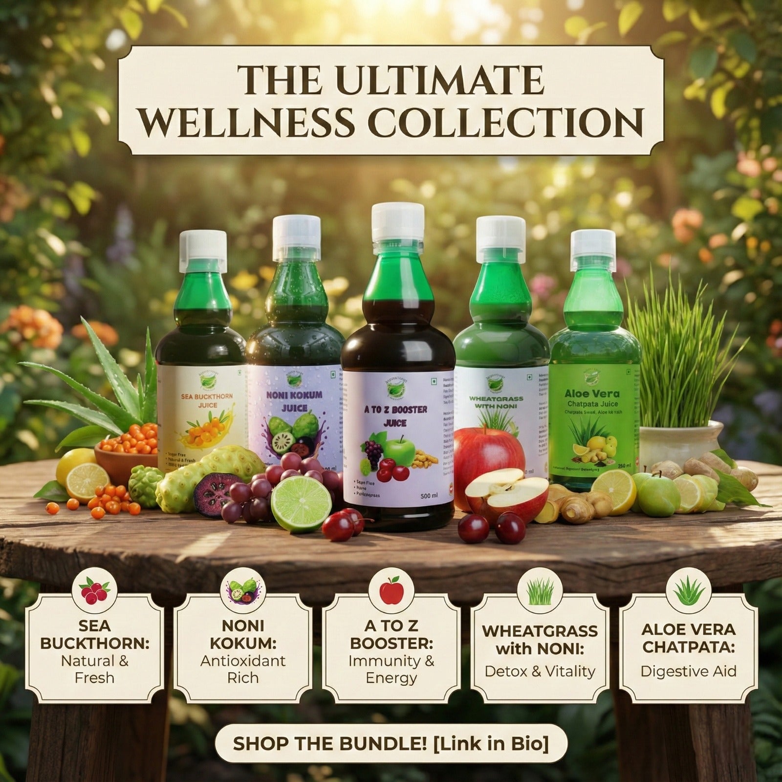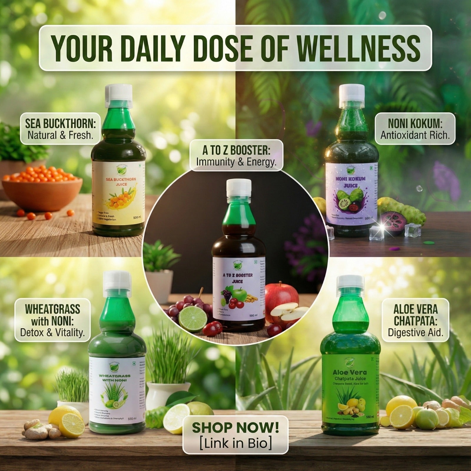 From A2Z Booster, Noni Kukum, Wheatgrass Noni, Sea Buckthorn and Berry Blend to Herbocid and other wellness formulations, we focus on offering real benefits in every sip. With a strong commitment to purity and transparency, we ensure that our customers enjoy products that are fresh, safe and genuinely effective.